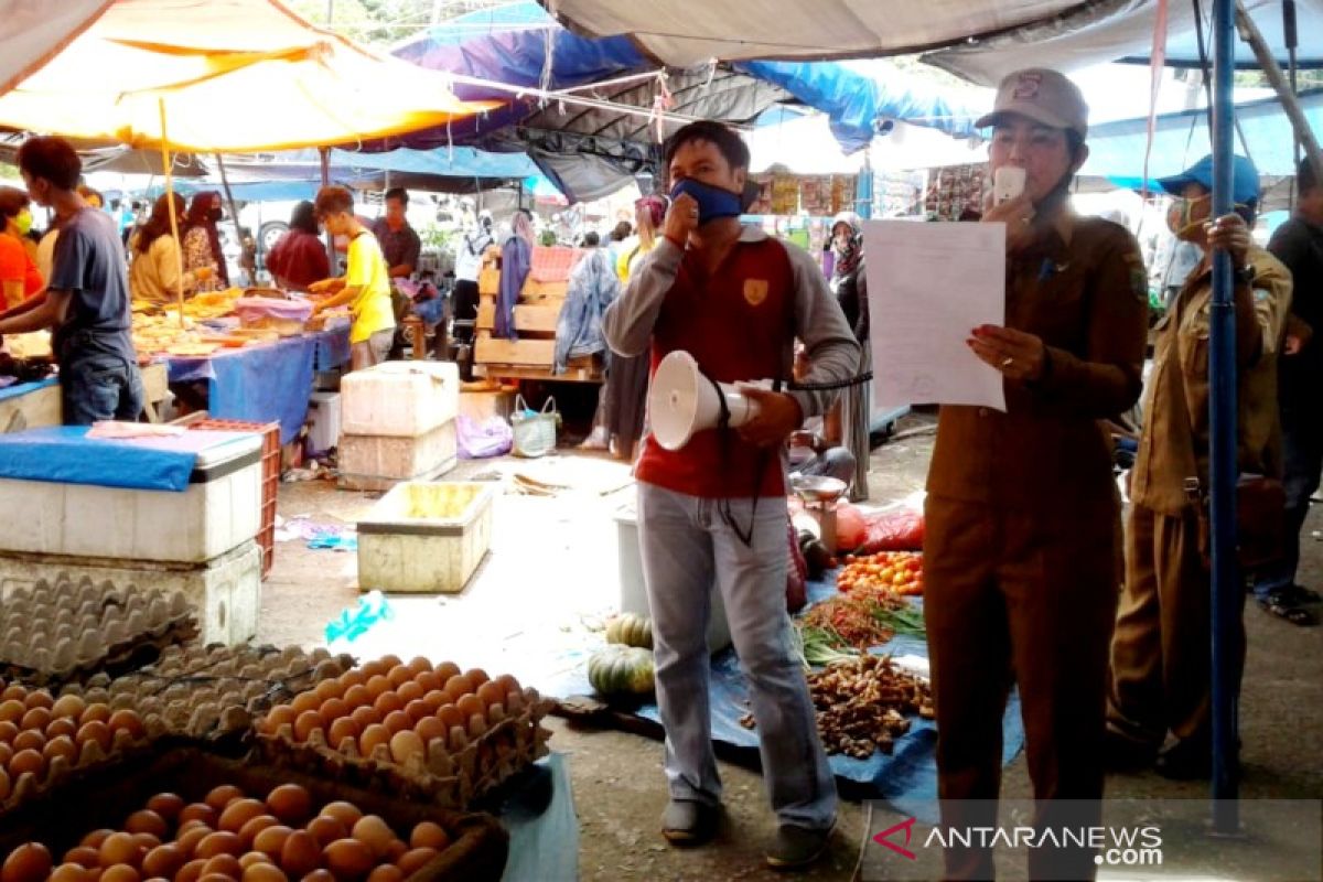 Kepala UPTD Pasar Temanggung Djaya Karti Tenny, menggunakan pengeras suara mensosialisasikan penutupan pasar mingguan kepada pengunjung dan pedagang di Pasar Temanggung Djaya Karti Tamiang Layang, Senin, (20/4/2020). (ANTARA/Habibullah)