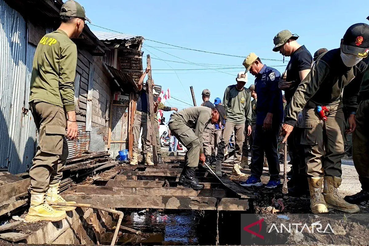 Sampit (ANTARA) - Satuan Polisi Pamong Praja (Satpol PP) Kabupaten Kotawaringin Timur (Kotim), Kalimantan Tengah mengerahkan personel untuk membersihkan sisa lapak pedagang yang melanggar aturan di area Pasar Keramat, Kota Sampit.