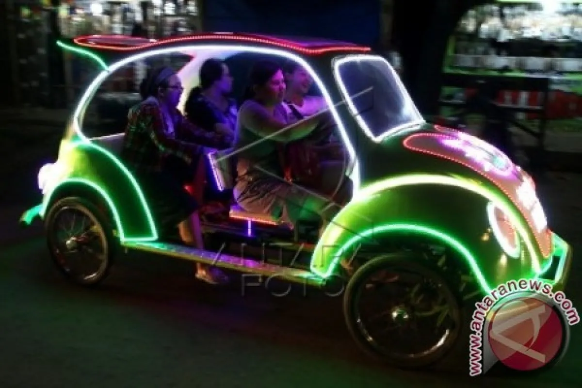 Sejumlah wisatawan menaiki mobil gowes di kawasan Pantai Pangandaran, Jawa Barat, Jumat (1/5). Selain sebagai hiburan, mobil gowes tersebut juga dimanfaatkan para wisatawan untuk berkeliling Pantai Pangandaran. ANTARA FOTO