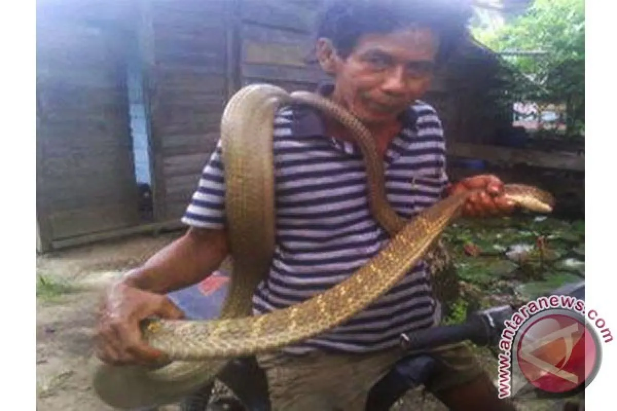 Idri warga Kelurahan Basirih Hilir, Kecamatan Mentaya Hilir Selatan, Kotawaringin Timur, Kalimantan Tengah memperlihatkan ular King Kobra hasil tangkapannya. King Kobra sepanjang empat meter di tangkap karena masuk ke rumah warga. Foto Antara Kalteng