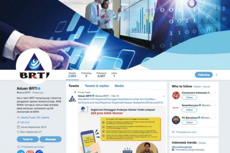 Jakarta (Antaranews Kalteng) - Komite Regulasi Telekomunikasi Badan Regulasi Telekomunikasi Indonesia (BRTI) membuka layanan aduan untuk SMS dan telepon spam berisi penipuan melalui akun Twitter dan aduan melalui telepon.