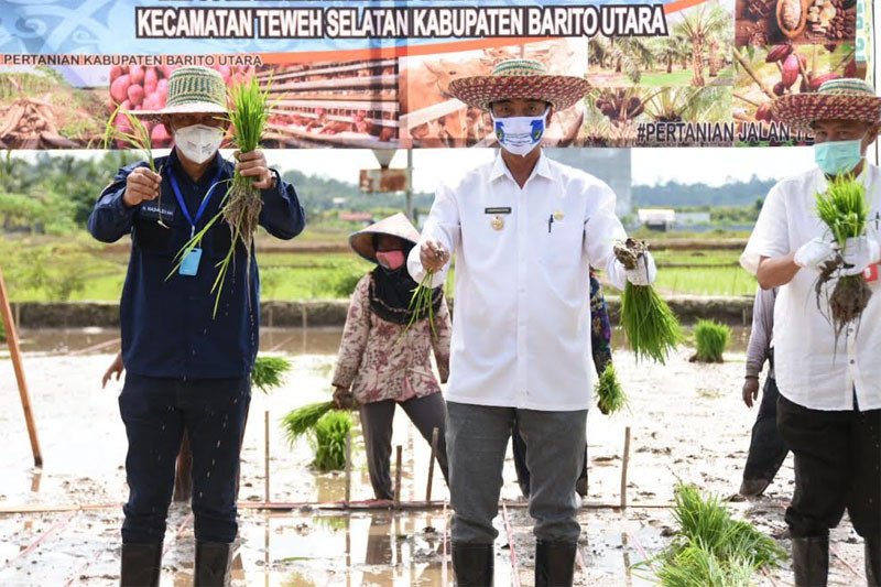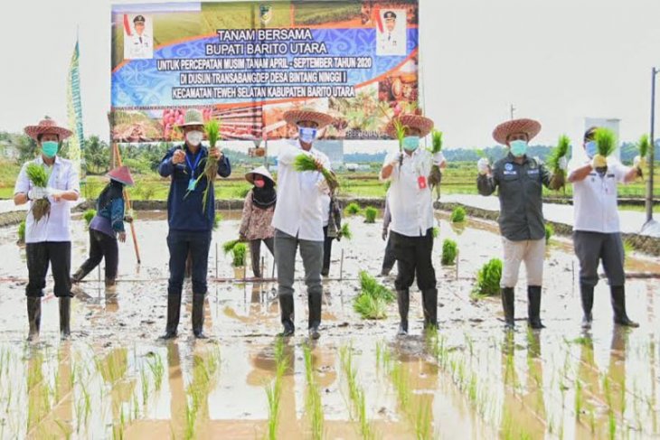 Muara Teweh (ANTARA) - Bupati Barito Utara, Kalimantan Tengah H Nadalsyah melakukan penanaman padi bersama guna percepatan musim tanam April - September (Asep) 2020 di lahan persawahan warga Dusun Transbangdep Kecamatan Teweh Selatan.