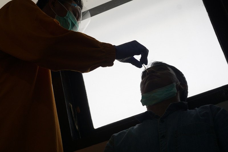 Petugas mengambil sampel lendir hidung dan tenggorokan dengan metode tes usap PCR (Polymerase Chain Reaction) ruang layanan Poli COVID di RSUD dr. Iskak, Tulungagung, Jawa Timur, Jumat (7/8/2020). Rumah sakit setempat melayani permintaan rapid test (tes cepat) maupun swab test (tes usap) gratis kepada warganya yang membutuhkan keterangan sehat COVID-19 untuk keperluan pekerjaan, sekolah maupun acara bepergian ke luar kota/luar negeri. ANTARA FOTO/Destyan Sujarwoko.