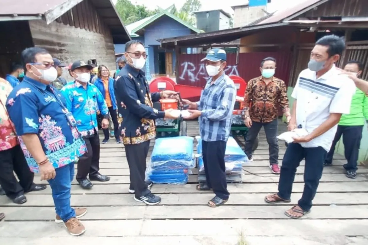 Wakil Bupati Katingan Sunardi N.T Litang (batik hitam) disaksikan Kepala Dinas Pertanian, Pangan dan Perikanan, Yossy S. Djala (depan kiri berbatik) memberikan secara simbolis tujuh mesin perontok padi kepada perwakilan kelompok tani yang ada di Kecamatan Pulau Malan dan Tewang Sangalang Garing, Kamis, (20/1/2022). (ANTARA/Dokumen Pribadi)