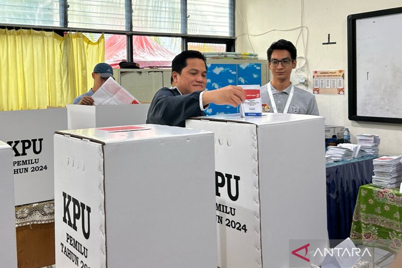 Jakarta (ANTARA) - Menteri Badan Usaha Milik Negara (BUMN) Erick Thohir bersama istri Elizabeth Tjandra Thohir dan ketiga anaknya menggunakan hak pilih pada Pemilu 2024 di Tempat Pemungutan Suara (TPS) 17 Jalan Gudang Peluru, Tebet, Jakarta, Rabu pagi.