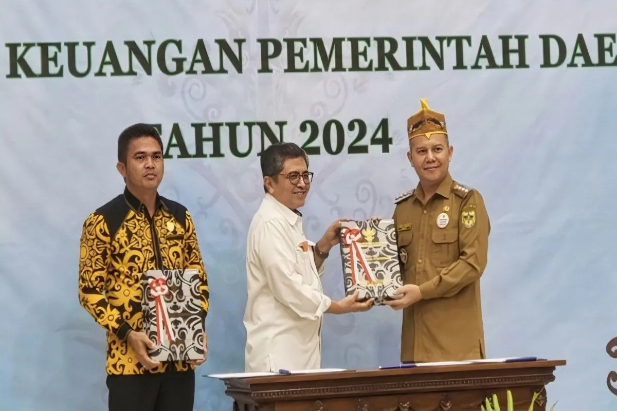 Bupati Gumas Jaya S Monong (kanan) dan Ketua DPRD Binartha (kiri) menerima LHP LKPD tahun anggaran 2024 dari Kepala BPK RI Perwakilan Kalteng Dodit Achmad di Palangka Raya, Senin (26/5/2025). (ANTARA/HO-BKAD Gumas)
