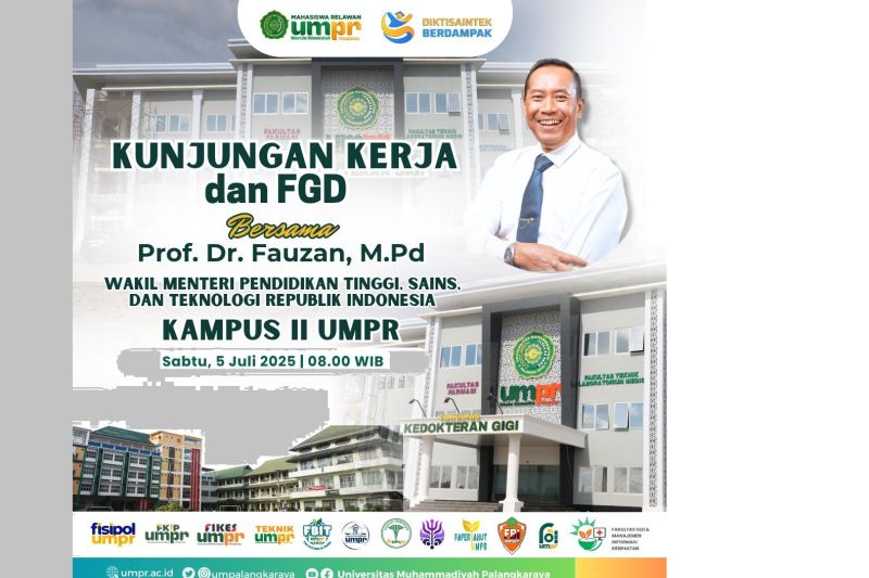 Palangka Raya (ANTARA) - Wakil Menteri Pendidikan Tinggi, Sains, dan Teknologi Republik Indonesia Prof Dr Fauzan MPd pada Sabtu, 5 Juli 2025 dijadwalkan melakukan kunjungan kerja ke Kampus II Universitas Muhammadiyah Palangka Raya (UMPR) yang dipusatkan di Aula Gedung Fakultas Kedokteran Gigi.