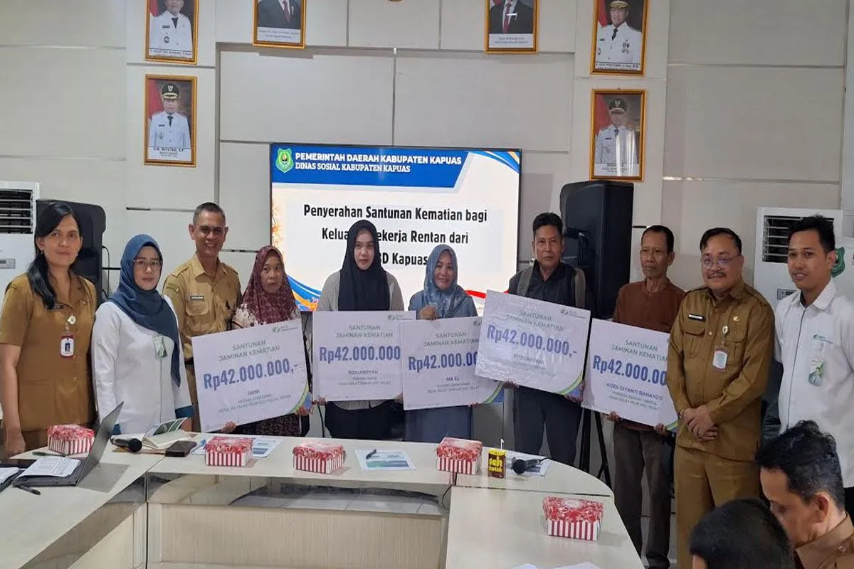 Kuala Kapuas (ANTARA) - Pemerintah Kabupaten Kapuas, Kalimantan Tengah, melalui Dinas Sosial setempat, menyerahkan santunan kematian secara simbolis kepada enam orang ahli waris pekerja rentan, yang telah mendapatkan perlindungan Jaminan Sosial Ketenagakerjaan dari APBD kabupaten setempat.
