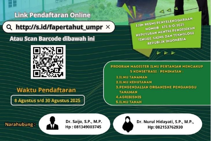Pendaftaran mahasiswa baru dibuka hingga 30 Agustus 2025 melalui tautan https://s.id/fapertahut_umpr.