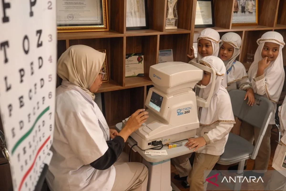 Petugas medis memeriksa kesehatan mata siswa SD Muhammadiyah Program Khusus Kottabarat saat peringatan Hari Anak Nasional di sekolah setempat, Solo, Jawa Tengah, Rabu (23/7/2025). Acara yang mengusung tema Mata Sehat untuk Anak Hebat itu digelar gratis guna mendeteksi masalah kesehatan mata para siswa sekaligus sebagai edukasi akan pentingnya kesadaran menjaga kesehatan mata sejak usia dini. ANTARAFOTO/Maulana Surya/nym. (ANTARA FOTO/Maulana Surya)