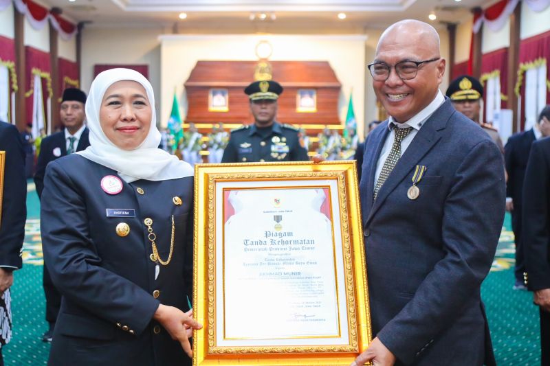 Surabaya (ANTARA) - Gubernur Jawa Timur Khofifah Indar Parawansa menganugerahkan Lencana Kehormatan Jer Basuki Mawa Beya Emas kepada Ketua Umum Persatuan Wartawan Indonesia (PWI) Pusat Akhmad Munir atas dedikasinya menjaga integritas dan kebebasan pers nasional.