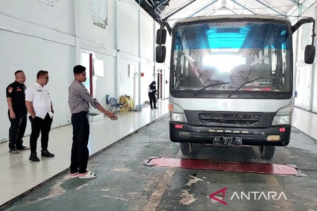 Kepala Dinas Perhubungan Kotawaringin Timur Raihansyah (kemeja putih) memantau uji KIR oleh tim UPTD Pengujian Kendaraan Bermotor terhadap sebuah kendaraan angkutan, Rabu (5/11/2025). ANTARA/Norjani
