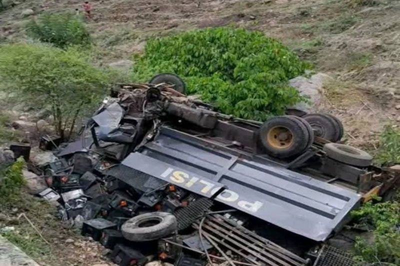 Dompu, NTB (ANTARA) - Truk Dalmas milik Polres Dompu yang mengangkut amunisi milik TNI terguling di tanjakan Moti Toi, Desa Tolokalo, Kecamatan Kempo, Kabupaten Dompu, Nusa Tenggara Barat, Kamis siang.