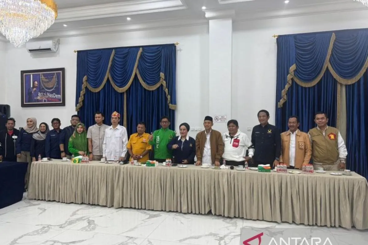 Palangka Raya (ANTARA) - Lima pimpinan partai politik (parpol) di Kalimantan Tengah seperti NasDem, PPP, PSI, Hanura dan Gerindra melakukan pertemuan di kantor NasDem Kalteng membahas dampak kebijakan pemerintah pusat terkait Transfer ke Daerah (TKD), kesiapsiagaan menghadapi potensi bencana, serta penyesuaian jadwal Pemilu 2029 pasca putusan Mahkamah Konstitusi (MK).
