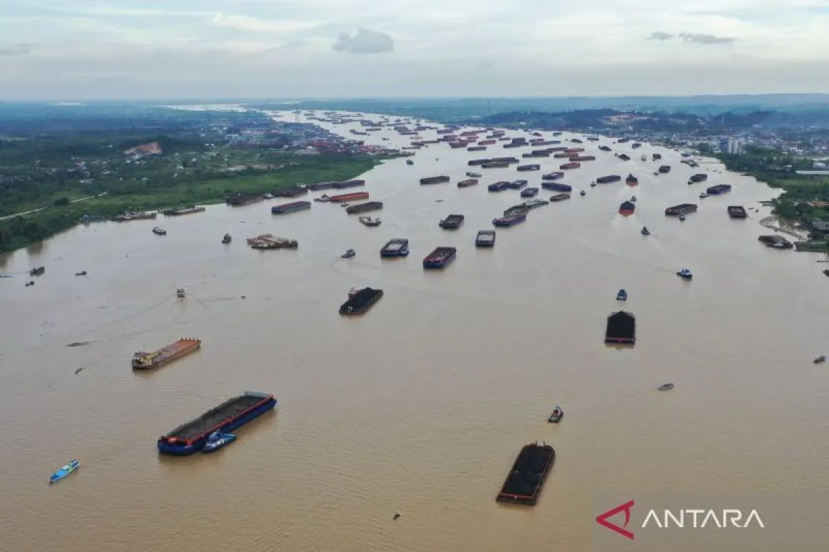 Sejumlah kapal tongkang pengangkut batu bara melintas di Sungai Mahakam, Samarinda, Kalimantan Timur, Selasa (2/12/2025).ANTARA FOTO/M Risyal Hidayat/bar