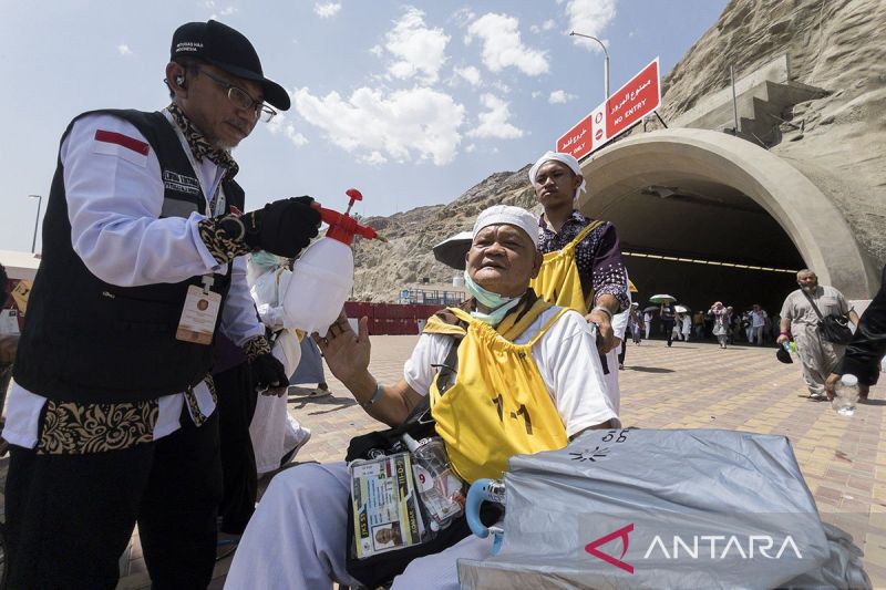 Ilustrasi - Petugas Penyelenggara Ibadah Haji (PPIH) Arab Saudi menyemprotkan air ke jamaah haji lansia Indonesia di Mina, Makkah, Arab Saudi. ANTARA FOTO/Sigid Kurniawan/nym/pri.