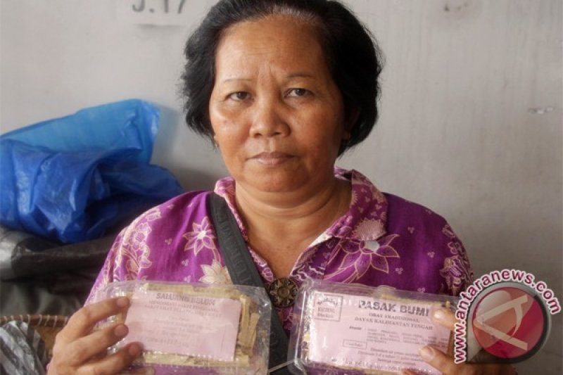 Palangka Raya, 14/3 - Seorang Penjual ramuan tradisional Kalimantan Tengah (Kalteng) di pasar tradisional modern, Kamis (14/3) saat memperlihatkan ramuannya yang sering dibeli masyarakat hingga keluar daerah Kalteng yaitu ramuan jenis Saluang Belum, Pasak Bumi, Sarang Semut, yang masih dipercaya bisa menyembuhkan segala macam penyakit. Meskipun telah memasuki perkembangan era modern, masyarakat masih tetap mempercayai ramuan tradisional tersebut, sebab dalam proses pembuatannya masih alami dan tidak ada mengandung unsur bahan kimia.(FOTO ANTARA Kalteng/Ronny NT)