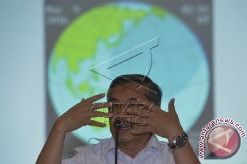 Kepala BMKG Andi Eka Sakya memberi keterangan pers mengenai fenomena gerhana matahari total yang akan terjadi pada 9 Maret 2016, di kantor BMKG, Jakarta, Kamis (11/3). Sebanyak 11 provinsi di Indonesia akan dilintasi gerhana matahari total pada tanggal tersebut, dan akan berlangsung lagi di tempat yang sama dalam jangka waktu 350 tahun. ANTARA FOTO/Rosa Panggabean