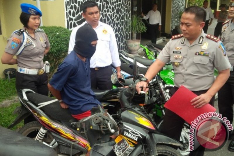 Tersangka curanmor saat diperiksa anggota Kepolisian Resor (Polres) Kotawaringin Timur, Kalimantan Tengah, Senin (7/3). Selain tersangka, polisi juga mengamankan barang bukti 15 unit sepeda motor, yang dilakukan tersangka sendiri. (Foto Antara Kalteng/Untung Setiawan)