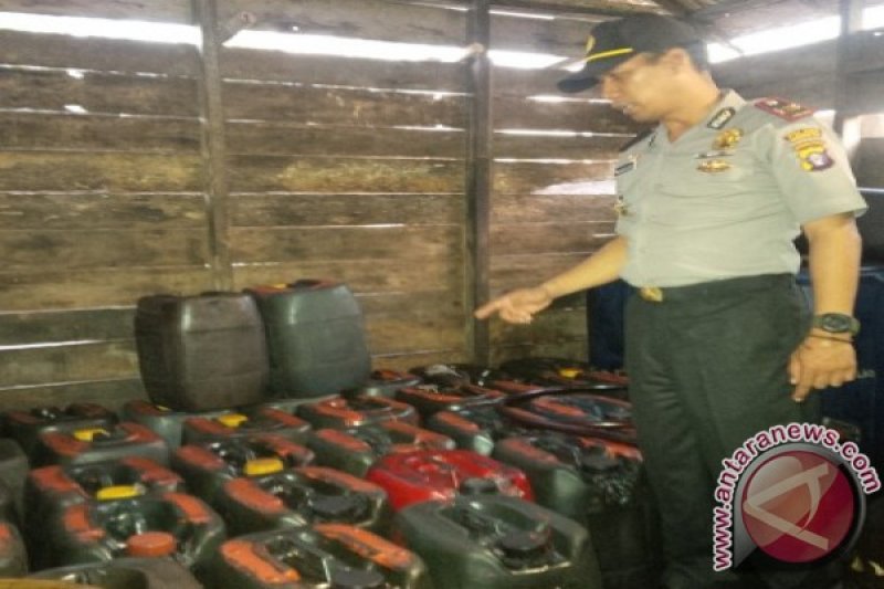 Kapolsek Sungai Sampit, Kecamatan Mentaya Hilir Utara, Kabupaten Kotawaringin Timur, Kalimantan Tengah, Iptu Masriwiyono (kanan) bersama anggotanya saat menggerebek gudang BBM subsidi ilegal, Selasa (8/3). Dalam penggerebekan itu polisi berhasil mengamankan 13.898 liter BBM jenis solar dan tiga orang tersangka. (Foto Antara Kalteng/Untung Setiawan)