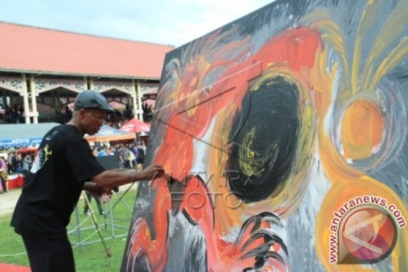 Pelukis melukis gerhana matahari di hadapan ribuan warga serta pimpinan satuan kerja perangkat daerah (SKPD) pada kawasan Lapangan Sanaman Mantikei di Kota Palangka Raya, Kalimantan Tengah, Rabu (9/3). Pelukis tersebut dihadirkan untuk memberikan hiburan sekaligus menyambut proses Gerhana Matahari Total (GMT) 2016. ANTARA FOTO/Ronny NT