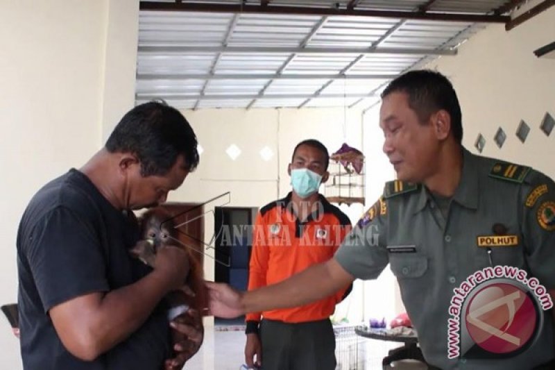 Satu bayi orangutan yang diperkirakan berusia tiga tahun di serahkan warga ke BKSDA Pos Sampit, Kotawaringin Timur, Kalimantan Tengah Rabu (16/3). Bayi orangutan tersebut ditemukan warga di semak-semak, diduga ditinggalkan induknya. FOTO ANTARA Kalteng/Untung Setiawan