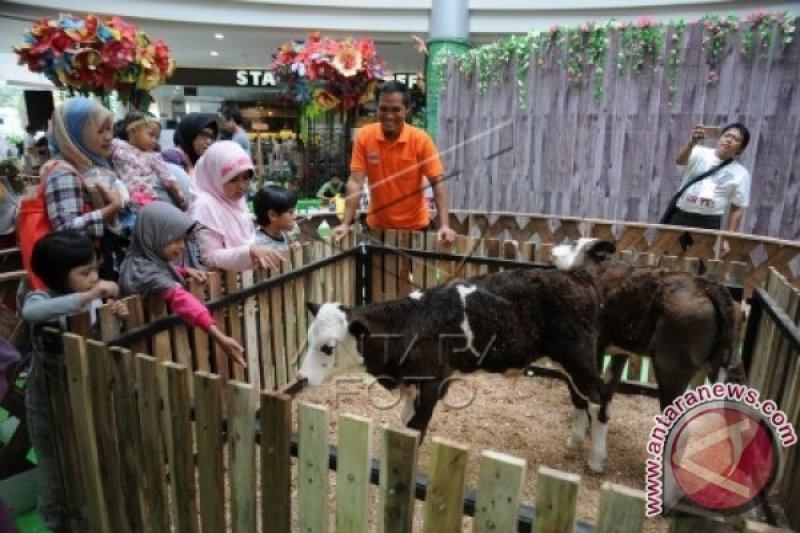 Sejumlah anak ditemani orangtua mereka bermain dengan hewan ternak sapi yang ditampilkan dalam wahana Margocity 'Back to Nature' di Pusat Belanja Margo City, Depok, Jawa Barat, Sabtu (19/3). Kegiatan belajar berternak dan berkebun di dalam mall yang berlangsung 15-27 Maret 2016 tersebut diselenggarakan sebagai sarana hiburan dengan nilai edukatif yang memperkenalkan anak kepada hewan dan alam, sekaligus dalam rangka memperingati ulang tahun pusat belanja Margo City yang ke-10. ANTARA FOTO/Indrianto Eko Suwarso