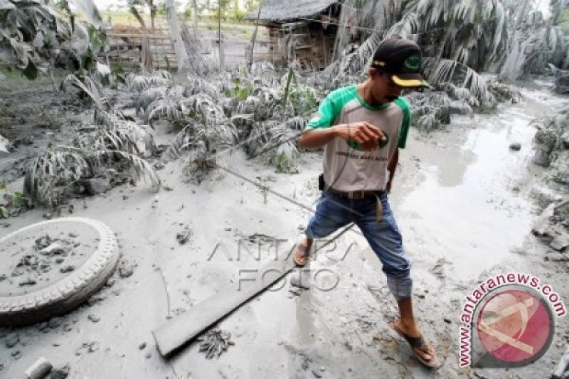 Warga melihat debu dan lumpur akibat semburan lumpur di Desa Blang Aman, Kabupaten Aceh Utara, Aceh, Senin (25/4). Semburan lumpur bercampur gas menyembur ke udara setinggi 15 meter itu menerbangkan debu hingga radius satu kilometer sehingga menutupi tanaman warga. ANTARA FOTO/Rahmad