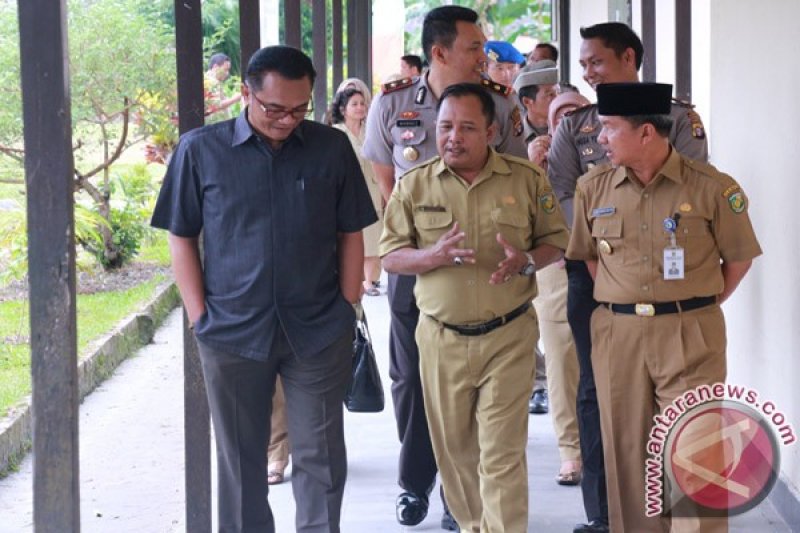 Wali Kota Palangka Raya, Kalimantan Tengah, HM Riban Satia (kanan) memantau pelaksanaan ujian nasional tingkat sekolah menengah pertama (SMP) yang letaknya sekitar 33 kilometer dari pusat kota di Palangka Raya, Senin (9/5). Pada kesempatan itu, Riban didampingi Ketua DPRD Kota Sigit K Yunianto (kiri) Kepala Dinas Pendidikan dan Kebudayaan Palangka Raya Norma Hikmah serta beberapa dari pejabat pemkot hingga pihak Kepolisian setempat ikut dalam kegiatan pemantauan pelaksanaan UN tingkat SMP. (FOTO ANTARA Kalteng/Rendhik Andika)