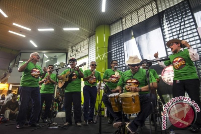 Wakil Ketua KPK Saut Situmorang (kanan) berjoget saat grup orkes Pancaran Sinar Petromaks membawakan sebuah lagu dalam sosialisasi antikorupsi bertajuk Ngamen Bareng Antikorupsi di Stasiun Gambir, Jakarta Pusat, Jumat (13/5). Kegiatan yang merupakan kerjasama KPK dengan PT Kereta Api Indonesia (Persero) tersebut merupakan upaya sosialisasi kepada masyarakat khususnya pengguna kereta api tentang seluk beluk dan bahaya korupsi. ANTARA FOTO/Sigid Kurniawan