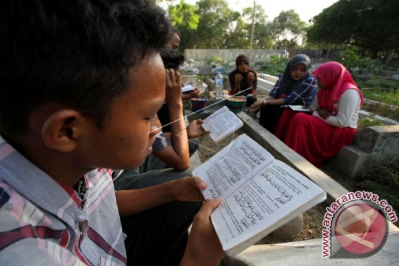 Umat muslim membaca surat Yasin dan berdoa di makam keluarga mereka saat ziarah kubur di Tempat Pemakaman Umum (TPU) Kuta Blang, Lhokseumawe, Provinsi Aceh, Sabtu (4/6). Ziarah kubur dilakukan umat muslim untuk mendoakan mendiang keluarga dan kerabat dan dilakukan masyarakat Aceh setiap H-2 datangnya bulan Ramadan. ANTARA FOTO/Rahmad