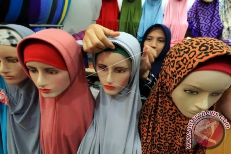 Pedagang menata jilbab di pusat penjualan busana muslim Los E Kota Lhokseumawe, Aceh, Selasa (14/6). Pedagang mulai menambah persediaan aneka jenis jilbab anak dan dewasa dengan harga Rp50 ribu hingga Rp250 ribu perjilbab. ANTARA FOTO/Rahmad