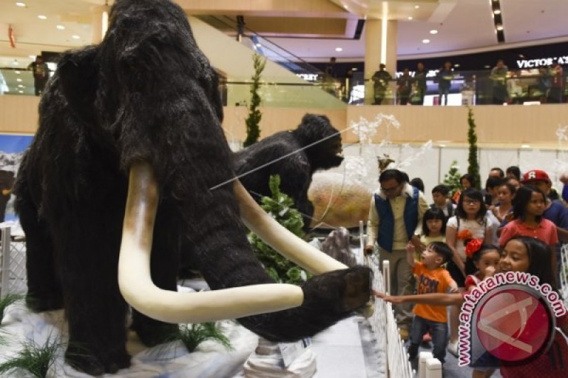 Pengunjung mengamati sejumlah hewan purba jaman es yang merupakan tokoh kartun film Titan From The Age of Ice di Atrium TP, Surabaya, Jawa TImur, Rabu (15/6). Pegelaran yang menampilkan 16 jenis hewan purba tersebut bertujuan untuk menghibur dan memberikan pengetahuan kepada pengunjung. ANTARA FOTO/Zabur Karuru