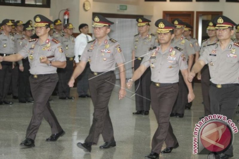 Kabareskrim Polri Komjen Pol Ari Dono Sukmanto (kiri) bersama Sahlijemen Kapolri Irjen Pol Arief Sulistyanto (kedua kiri) dan sejumlah perwira tinggi Polri bersiap dalam upacara dalam Korps Raport Kenaikan Pangkat Pati dan Pamen Polri yang digelar di Gedung Rupatama, Mabes Polri, Jakarta, Kamis (30/6). Sebanyak 16 perwira tinggi menjalani upacara kenaikan pangkat dan 74 perwira menengah (pamen) mendapatkan kenaikan pangkat dan Kapolri Jenderal Pol Badrodin Haiti bertindak sebagai inspektur upacara. ANTARA FOTO/Reno Esnir