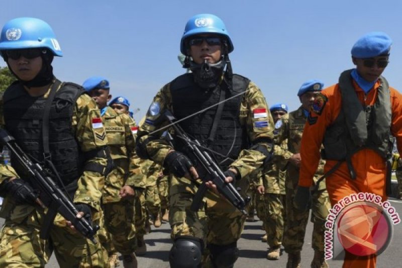 Prajurit Satgas Maritim TNI Konga XXVIII-I/UNIFIL berbaris ketika mengkuti upacara keberangkatan menuju Laut Lebanon di Dermaga Madura Koramatim, Surabaya, Jawa Timur, Kamis (11/8). Satgas yang berjumlah 107 tersebut merupakan Satgas Maritim TNI pertama yang diberangkat menggunakan pesawat udara menuju Lebanon yang sebelumnya melalui lintas laut menggunakan KRI. ANTARA FOTO/Zabur Karuru