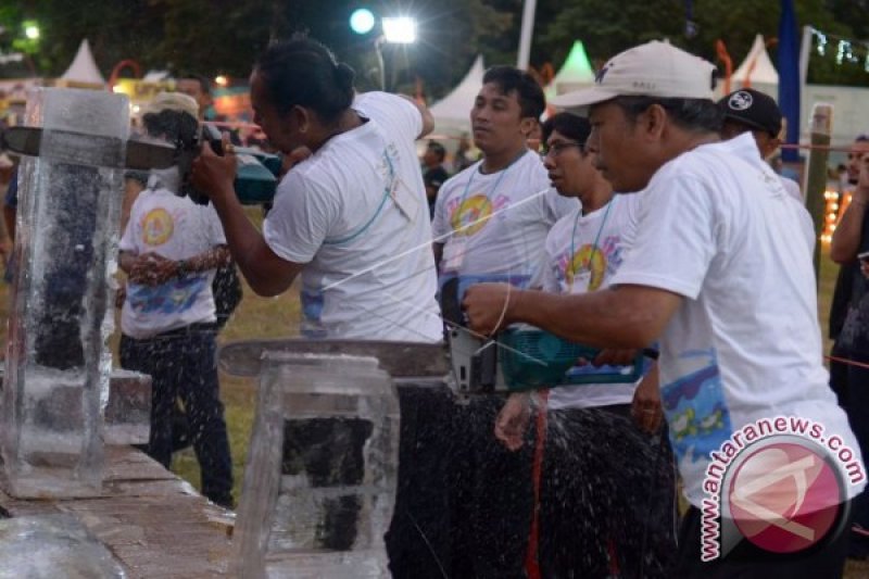 Seniman memahat es dalam rangkaian Sanur Village Festival 2016 di Pantai Sanur, Bali, Jumat (26/8). Kegiatan tersebut sebagai ajang kreativitas para seniman dengan menampilkan seni pahat yang bersifat abstrak. ANTARA FOTO/Wira Suryantala