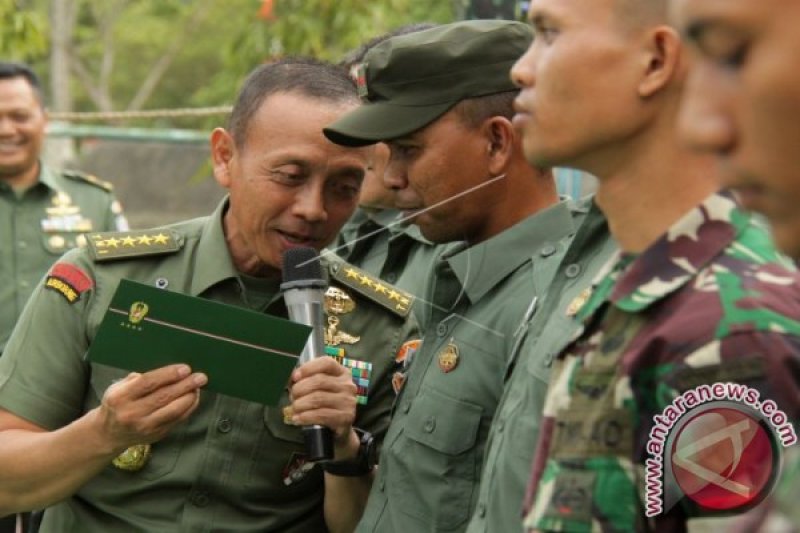 Kepala Staf Angkatan Darat (KASAD) Jenderal TNI Mulyono (kiri) memberikan bonus kepada prajurit Kodam Iskandar Muda yang berani mengajukan pertanyaan kepadanya saat pertemuan di Batalyon Raider 112 Darma Jaya, Mata Ie, Kabupaten Aceh Besar, Aceh, Senin (29/8). Dalam kunjungan terbuka dan tanya jawab dengan prajurit itu, Kasad Jenderal TNI Mulyono menyatakan akan meningkatkan kesejahteraan prajurit Babinsa yang bertugas di pedesaan berupa tunjangan sebesar Rp1 juta lebih besar dari sebelumnya yang Rp150 ribu. ANTARA FOTO/Ampelsa
