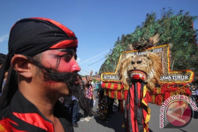 Peserta dari Paguyuban Singo Mangku Joyo menampilkan kesenian Reog dalam aksi Panggung Budaya Bela NKRI di Surabaya, Jawa Timur, Sabtu (19/11). Kegiatan tersebut bertujuan untuk menunjukkan identitas keragaman budaya, suku dan agama bangsa Indonesia sebagai bagian dari Bhinneka Tunggal Ika serta merawat Pancasila, UUD 1945 dan NKRI. ANTARA FOTO/Moch Asim