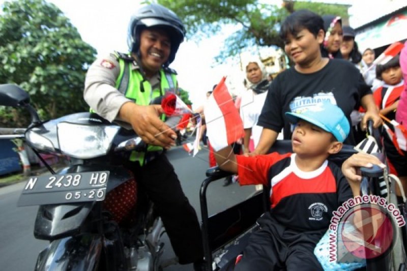 Seorang siswa penyandang disabilitas membagikan bunga kepada polisi saat mengikuti jalan santai memperingati hari Disabilitas Internasional di Blitar,Jawa Timur, Sabtu (3/12). Aksi jalan santai sambil membagikan bunga kepada pengguna jalan tersebut, bertujuan untuk mengkampanyekan kesetaraan serta hak penyandang disabilitas. ANTARA FOTO/Irfan Anshori