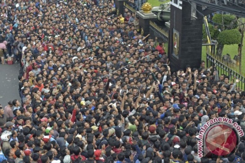 Personel Kostrad mengatur warga yang mengantre untuk membeli tiket offline final AFF Suzuki Cup 2016 antara timnas Indonesia melawan Thailand di Makostrad Jakarta, Selasa (13/12). PSSI mendistribusikan 10.000 lembar tiket kategori tiga yang dijual secara offline di Markas Garnisun Tetap 1 Jakarta serta 5.000 lembar tiket di Makodim, Kabupaten Bogor. ANTARA FOTO/Wahyu Putro A