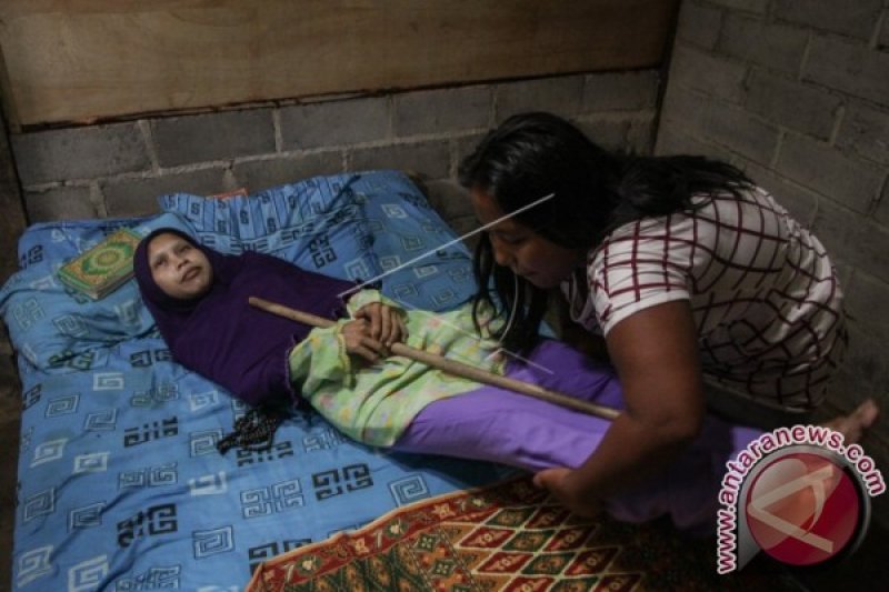 Anggota keluarga membantu menaikkan Sulami (35) penderita penyakit langka punggung kayu atau bamboo spin ke tempat tidur di rumahnya Desa Mojokerto, Kedawung, Sragen, Jawa Tengah, Senin (23/1). Sejak berumur 10 tahun Sulami dikenal sebagai manusia kayu karena hampir seluruh tubuhnya kaku kecuali tangan dan kepala, berdasarkan diagnosis medis ia diduga menderita penyakit Ankylosing Spondylitis. ANTARA FOTO/Mohammad Ayudha