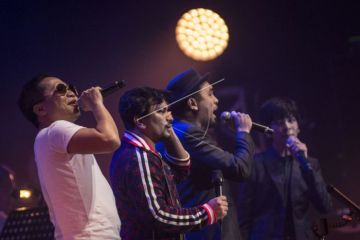 Penyanyi yang tergabung dalam Yamaha Music Project Sandhy Sandoro (kiri), Tompi (kedua kiri), Glenn Fredly (kedua kanan) dan Kafin Sulthan (kanan) beraksi dalam Jakarta International BNI Java Jazz Festival 2018 di JIExpo Kemayoran, Jakarta, Sabtu (3/3). Penyanyi dan musisi itu membawakan sejumlah lagu diantaranya lagu berjudul Nirwana, Cintakan Membawamu Kembali, dan Cukup Siti Nurbaya. ANTARA FOTO/Aprillio Akbar