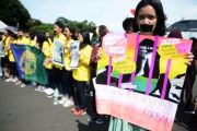 Sejumlah mahasiswa menggelar aksi unjuk rasa menolak RUU KUHP di Jakarta, Sabtu (10/3). Dalam aksinya mereka mengatakan bahwa RUU KUHP berpotensi digunakan untuk mengkriminalisasi korban kekerasan seksual. ANTARA FOTO/Akbar Nugroho Gumay