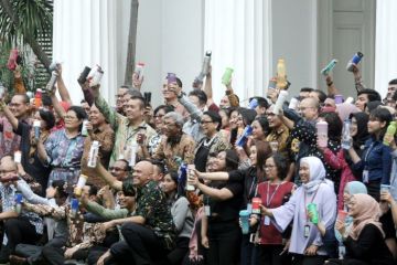 Menteri Luar Negeri (Menlu) Retno LP Marsudi (tengah) didampingi Wakil Menteri Luar Negeri (Wamenlu) AM Fachir (ketujuh kiri) dan staf merayakan hari kerja pertama di tahun 2019 dengan berfoto bersama seraya mengangkat botol tempat minum di halaman Gedung Pancasila, Kementerian Luar Negeri, Jakarta, Rabu (2/1/2019). Di hari kerja pertama itu, Kementerian Luar Negeri berkomitmen untuk menjaga kebersihan lingkungan dan mengurangi sampah plastik dengan menggalakkan penggunaan gelas, sedotan, alat makan stainless, hingga tas yang dapat digunakan kembali. ANTARA FOTO/Suwandy/pras.