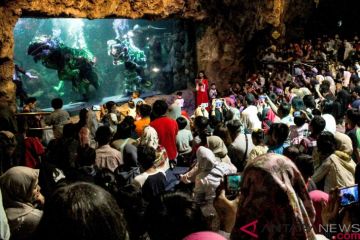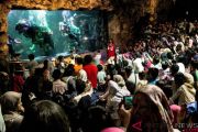 Pengunjung menyaksikan pertunjukan barongsai di dalam air di Seaworld Ancol, Jakarta, Minggu (3/2/2019). Pertunjukan dalam rangka memeriahkan Tahun Baru Imlek 2570 tersebut mengangkat tema "The Legend of 12 Shio" yang digelar hingga 5 Februari 2019. ANTARA FOTO/Putra Haryo Kurniawan/aww.