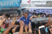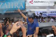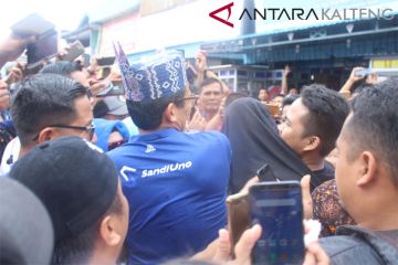 Meski diguyur hujan yang cukup deras, warga antusias mendatangi dan menyapa calon wakil presiden nomor urut 02 Sandiaga Salahudin Uno saat mengunjungi Sentra Suvenir di kawasan Pasar Besar di Palangka Raya, Kalimantan Tengah, Senin, (4/2/2019). Ratusan warga 'Kota Cantik' Palangka Raya khususnya kaum perempuan merasa senang bahkan histeris melihat secara langsung kedatangan Sandiaga Uno. (Foto Antara Kalteng/Muhammad Arif Hidayat).
