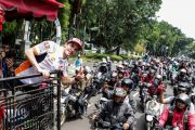 Pembalap MotoGP Marc Marquez (kanan) berkeliling kota Bandung menggunakan Bandros (Bandung Tour on Bus) di Bandung, Jawa Barat, Sabtu (9/2/2019). Marc Marquez datang ke Bandung usai menjalani tes pramusim MotoGP di Sepang, Malaysia. (ANTARA FOTO/Jessica/agr/aww).