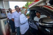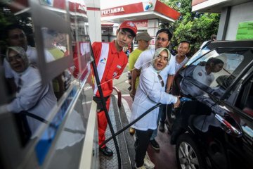 Direktur Utama Pertamina Nicke Widyawati (tengah) didampingi Direktur Pemasaran Masud Khamid (kanan) mengisi Bahan Bakar Minyak (BBM) jenis Pertamax pada mobil konsumen saat sidak ke SPBU Unsil, Kota Tasikmalaya, Jawa Barat, Minggu (10/2/2019).Sidak tersebut untuk memastikan harga BBM non subsidi disesuaikan, seperti Pertamax turun Rp350 per liter, Pertamax Turbo Rp800 per liter, Dexlite Rp100 per liter dan Dex Rp50 per liter. (ANTARA FOTO/Adeng Bustomi/ama).