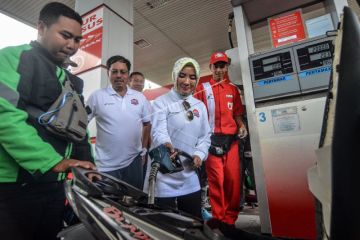 Direktur Utama Pertamina Nicke Widyawati mengisi Bahan Bakar Minyak (BBM) jenis Pertamax kepada ojek motor saat sidak ke SPBU Unsil, Kota Tasikmalaya, Jawa Barat, Minggu (10/2/2019). Sidak tersebut untuk memastikan harga BBM non subsidi disesuaikan, seperti Pertamax turun Rp350 per liter, Pertamax Turbo Rp800 per liter, Dexlite Rp100 per liter dan Dex Rp50 per liter. (ANTARA FOTO/Adeng Bustomi/ama).