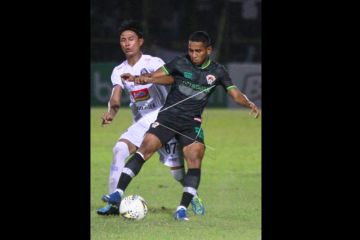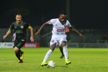 Pesepak bola Arema FC Riky Kayame (kanan) mengontrol bola dibayangi pesepak bola Kalteng Putra Yu Hyunkoo (kiri) saat pertandingan leg kedua Semifinal Piala Presiden di Stadion 17 Mei Banjarmasin, Kalimantan Selatan, Jumat (5/4/2019). Arema FC mengalahkan Kalteng Putra pada Leg kedua semifinal Piala Presiden dengan skor 3-0. (ANTARA FOTO/Bayu Pratama S/ama).